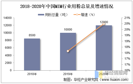 2018-2020年中國MIM行業(yè)用粉總量及增速情況